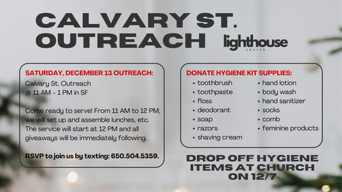 Lighthouse Church is partnering with Calvary St. for their Saturday outreach in the Tenderloin District. We will lead a time of worship, share a message, distribute lunches, pray for people, hand out hygiene kits, give haircuts, and more!